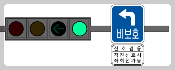 이따금씩 도로에 마주하는 좌회전 신호 겸용 비보호 좌회전도 볼 수 있습니다. 이는 4색 신호등에 비보호좌회전 표지를 추가로 부착한 것으로 이 경우는 삼거리에서 횡단보도 위치 특성상 직진 후 직좌가 불가능한 곳이나, 직진차량 통행량이 적고 좌회전 통행량이 한시적으로 많아지는 곳이라 좌회전 수요에 대응하기 위해서이다. 이때 신호등 옆에 "직진신호 시 좌회전가능" 또는 "신호겸용"이라는 표지판을 부착한다. 직진 신호 시에는 비보호로 좌회전하고, 좌회전 신호시에는 신호 보호를 받아 좌회전할 수 있습니다.