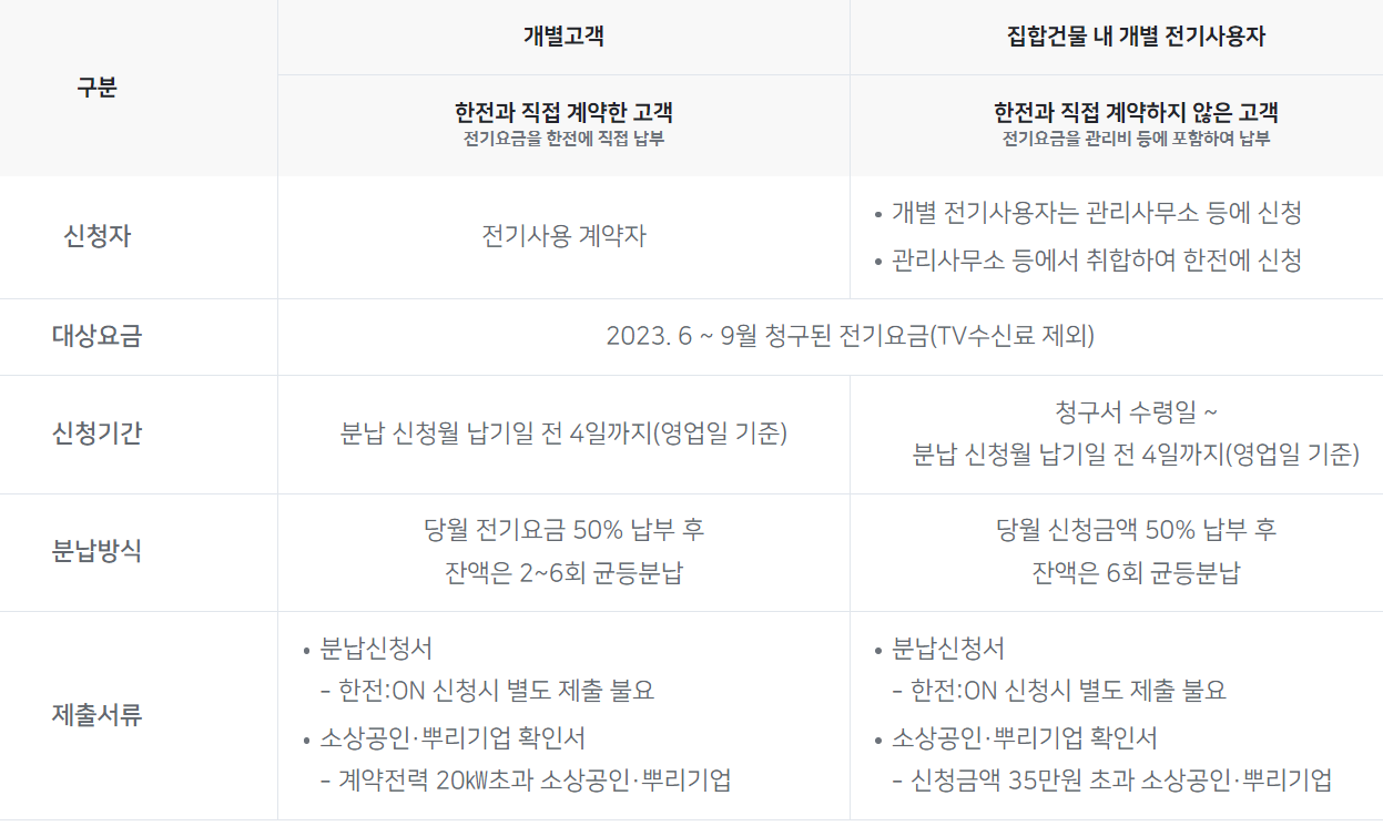 소상공인 전기요금 분할납부 신청대상은 주택용(가정용) 및 소상공인 · 뿌리기업(일반용,산업용,비거주용, 주택용) 고객으로 본인 명의(실명)로 전기를 사용하고 미납 요금이 없으면 소상공인 전기요금 분할납부 신청이 가능합니다.