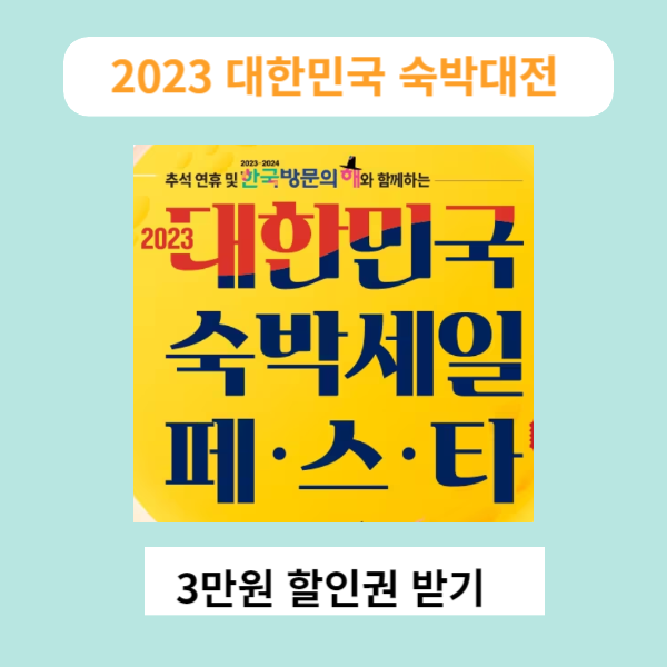숙박할인권은 10월 2일 임시공휴일 지정으로 생겨난 황금연휴를 국내 여행 활성화의 기회로 활용하고자 시기를 당겨 추석 연휴에 30만 장을 배포합니다. 숙박할인권은 30만장 소진 시 조기 종료 예정이오니 여행을 준비 중이시며 아래 2023 대한민국 숙박대전 세일 페스타 링크를 통해 할인권 소진전에 미리 예매 신청하시길 바랍니다.