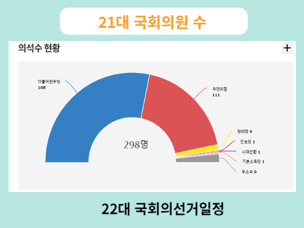 21대 국회의원은 2020년 4월15일 선거를 치루어져 임기를 시작하였으며 국회의원의 임기는 4년제로 내년 2024년 4월10일 수요일 22대 국회의원 선거일정이 예정되어있습니다. 21대 국회의원 수는 총300명으로 시작하였으나 의원직 상실로인해 현재는 298명으로 이루어져 있습니다. 더불어민주당이 168명,국민의힘이 111명,무소속이 9명,정의당6명,기본소득당이1명 진보당과시대전환이 각각1명으로 구성되어있습니다.