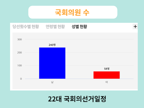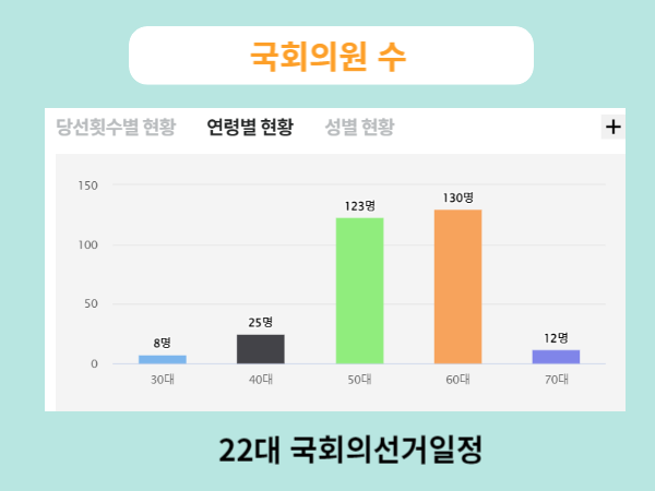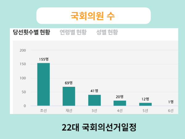아래는 국회의원의 당선횟수별 현황과 연령별 현황 및 성별구분을 통해 나늬어진 통계임으로 참조하시길 바랍니다.