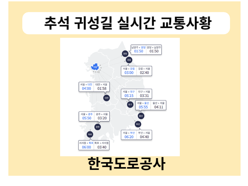 귀성길 소요시간 외에 도로교통공사홈페이지에서는 노선별 교통혼잡예보와 고속도로 실시간 CCTV 및 고속도로 사고지점에 대한 우회도로 정보를 실시간으로 확인할 수 있으니 귀성길 출발 전에 실시간 고속도로 교통상황을 파악하여 우회하시거나 시간을 잠시 조율하여 출발하는 것을 권해드립니다.