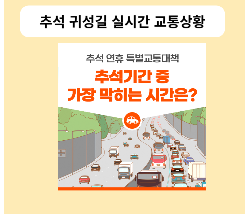 한국도로공사에 의하면 이번 추석연휴 귀성길 출발은 추석 전날(9.28, 목) 오전과 귀경길 출발은 추석 다음 날(9.30, 토) 오후가 가장 많을 것으로 예상될 거라 밝혔습니다. 국토교통부는 9월 27일(수)부터 10월 3일(화)까지 7일간을 추석 고속도로 교통상황 “특별교통대책기간”(이하 대책기간)으로 정하고, 안전하고 편리한 고향 가는 길을 위해 관계기관 합동으로 “추석연휴 특별교통대책”을 시행하고 있습니다.