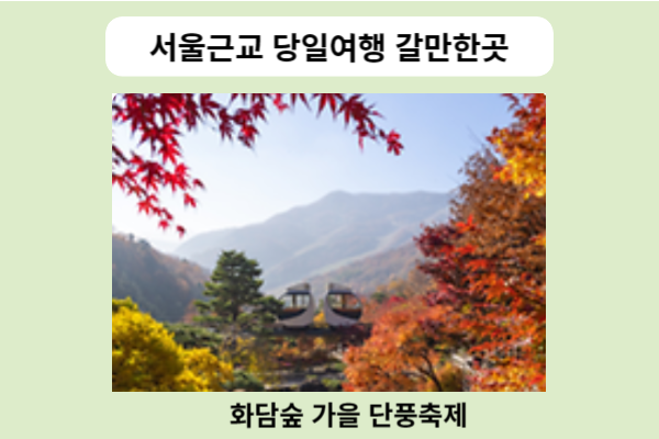 서울과 경기도 가볼만한곳 두 번째로는 국내 단풍 명소로 자리 잡은 화담숲입니다. 올 해에도 어김없이 청명한 하늘 아래 시원한 바람과 함께 가을이 찾아와 내장단풍, 당단풍, 털단풍, 노르웨이단풍 등 400여 품종의 형형색색 단풍이 장관을 이루고 있습니다. 화담숲은 단품 외에 4000여가지의 식물과 모노레일을 타면서 가을 경치를 구경하며 지친 몸과 마음을 함께 힐링할 수 있는 최고의장소입니다. 화담숲은 방문할 때는 많은 관광객들이 방문하여 예약제로 운영하고 있습니다. 예약이 필수이며 아래 화담숲 공식홈페이지를 통해 예약하시길 바랍니다. 화담숲은 10월 20일부터 11월 중순까지 한달여간 <가을 단풍 축제>를 진행합니다.