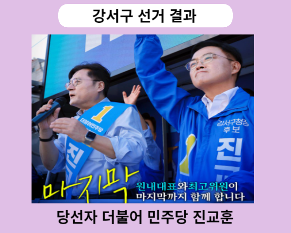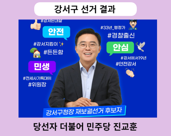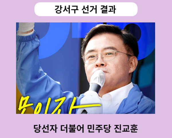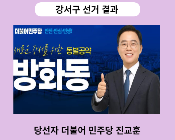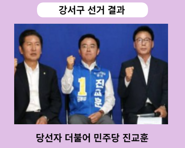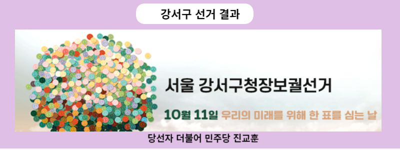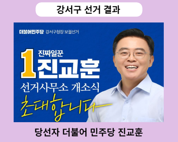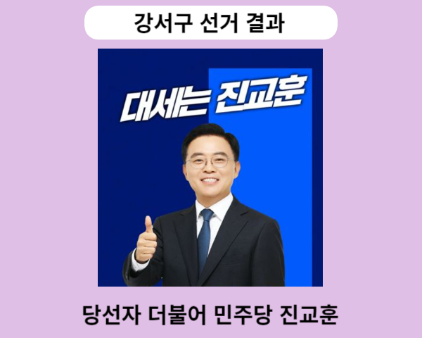 중앙선거관리위원회는 10월11일 실시한 강서구 재보궐선거 투표에 대한 강서구 선거 결과 당선자 발표를 금일 새벽 개표완료와 함께 당선자를 발표했습니다. 강서구 선거 결과 당선자는 기호1번 더불어 민주당 당선자 진교훈 후보입니다.