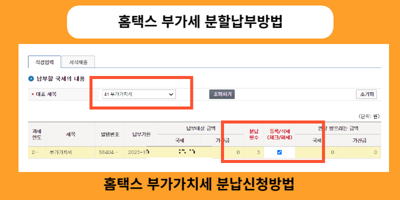화면이 전환된 후 인적사항 하단부에 납부할 국세의 내용 중 대표세목을 41. 부가가치세를 선택하여 조회하기를 하시면 사업자의 납부해야 할 부가가치세 세금이 나오며 분납 횟수를 기입하시고 오른쪽 부분에 등록/삭제부를 체크해주시면 됩니다.