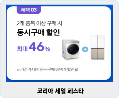 삼성전자 코리아 세일페스타 기간동안 삼성위크수퍼세일행사는 다양한 구매 혜택을 포함한 슈퍼 세일행사을 진행하고 있습니다. 삼성카드 결제시 최대 90만원까지 금액대별 결제일 할인을 하고 있습니다. 삼성 세일 페스타 행사는 200만원 이상 결제시 온라인 문화상품권 10만원 교환권을 증정하고 있으며 2개 품목 이상 구매시 최대 46% 동시 구매 할인까지 적용하여 세일행사를 하고 있으니 이 기회를 놓치지마시기 바랍니다.