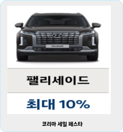 코리아 세일페스타중 가장 핫한 세일 페스타 업체인 현대 기아차는 코리아 세일페스타 기간중 구매차량에 대한 할인행사를 대폭 늘렸다고 밝혔습니다.현대차는총 23개 차종을 할인행사를 하며 승용·RV 21개 차종 2만3000대, 상용 2개 차종 1만5000대 할인하며 승용의 경우 캐스퍼는 최대 17%, 코나 최대 200만원, 팰리세이드 최대 10%, 그랜저 최대 400만원, 제네시스 G80 최대 10% 등을 할인한다. 상용차인 파비스는 최대 500만원, 마이티는 최대 400만원 할인 판매할 예정입니다.