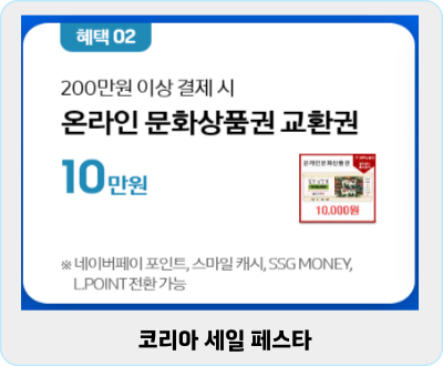 이현대차 코리아세일페스타는 차량구매시 최대 400만원차량 할인과 삼성전자는 삼성 세일 페스타 기간동안 삼성카드 결제 시 금액대별 결제일 할인 최대 90만원 및 동시구매시 최대 46%할인행사가 있으며 lg전자 또한 세일 페스타 기간중 각종 할인행사와 구매 고객 1000명에게 추첨 사은품을 드리고 있으니 아래 기업별 세일 페스타 링크를 통해 할인행사내용을 직접확인하시길 바랍니다.삼성 세일 페스타 홈페이지에서 다향한 혜택을 확인하시기 바랍니다.