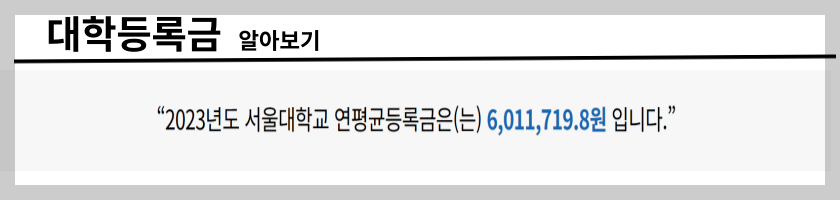 2024년 수능시험이 끝나고 이제 논술을 마친 학생들과 또는 정시를 준비하는 친구들이 각종 인터넷 매체를 통해 자신의 성적으로 갈수 있는 대학을 확인하는 시점입니다. 그리고 마지막으로 부모님들이 확인해야하는 일은 대학 등록금입니다. 자녀가 합격 할 학교의 대학 등록금을 확인하시고 미리 준비해두거나 계획을 잡아두시는것이 차후에 발생 할 수 있는 문제를 미연에 방지할수 있을거라 생각합니다. 자세한 내용은 합격통지서와 함께 대학 등록금 납부시 알수 있지만 미리 예상금액을 확인하는것을 추천드립니다, 아래 정부에서 운영하는 대학알리미를 통해 각 학교의 대학 등록금을 확인하시기 바랍니다.
