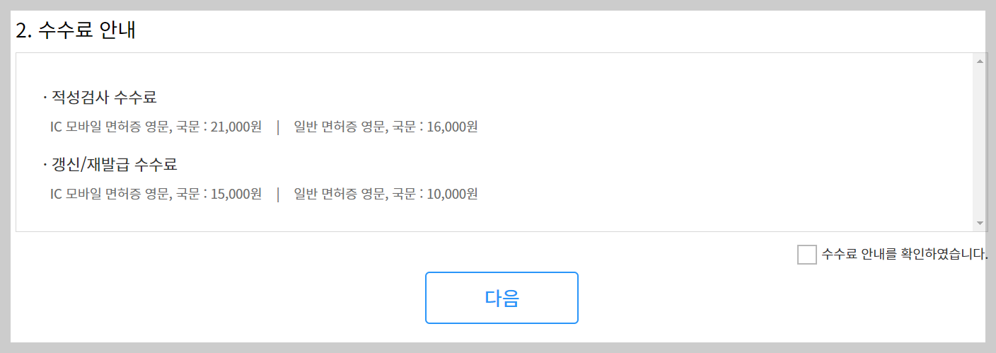 온라인 신청 시 건강검진 기록이 있어야 합니다. 최근 2년 이내 건강검진 결과가 없는 경우에는 면허시험장을 찾아 신체검사를 받고 검사 비용을 부담하면 됩니다. 이땐 면허 종류에 따라 6,000원 내외의 검사 비용이 발생합니다.